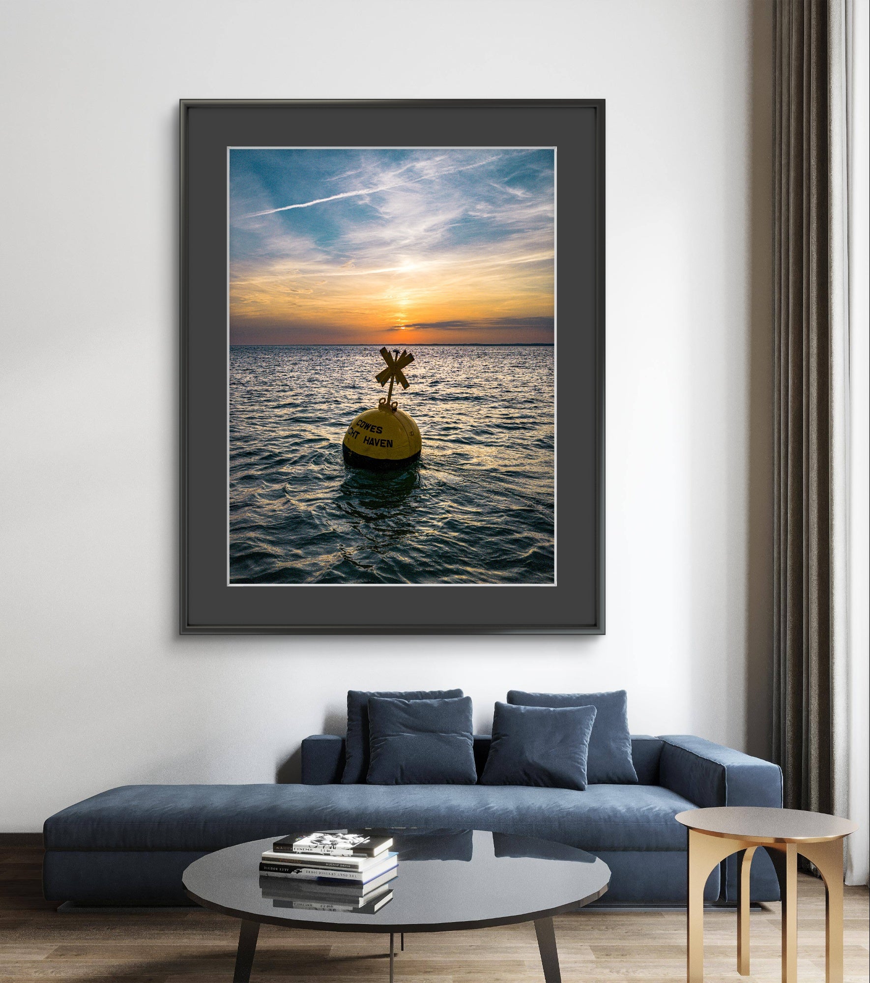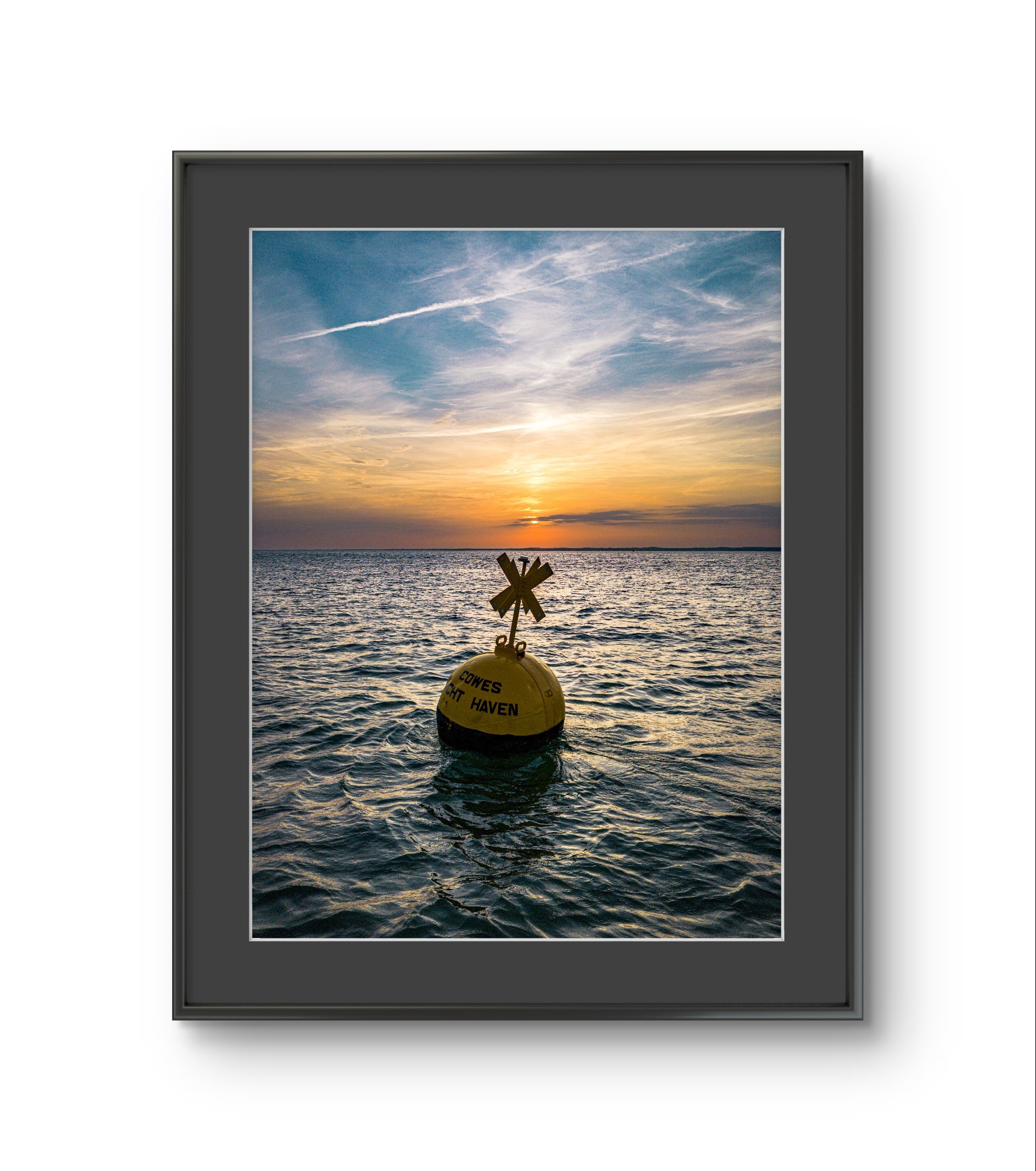 Bathed in the warm glow of a setting sun, this evocative image captures a moment of quiet stillness off the coast of Cowes. The buoy—marked Cowes Yacht Haven—rises like a sentinel from the glistening Solent, silhouetted against a canvas of amber and indigo sky. Gentle ripples cradle the buoy in a scene that speaks of solitude, navigation, and the eternal pull of the horizon.
