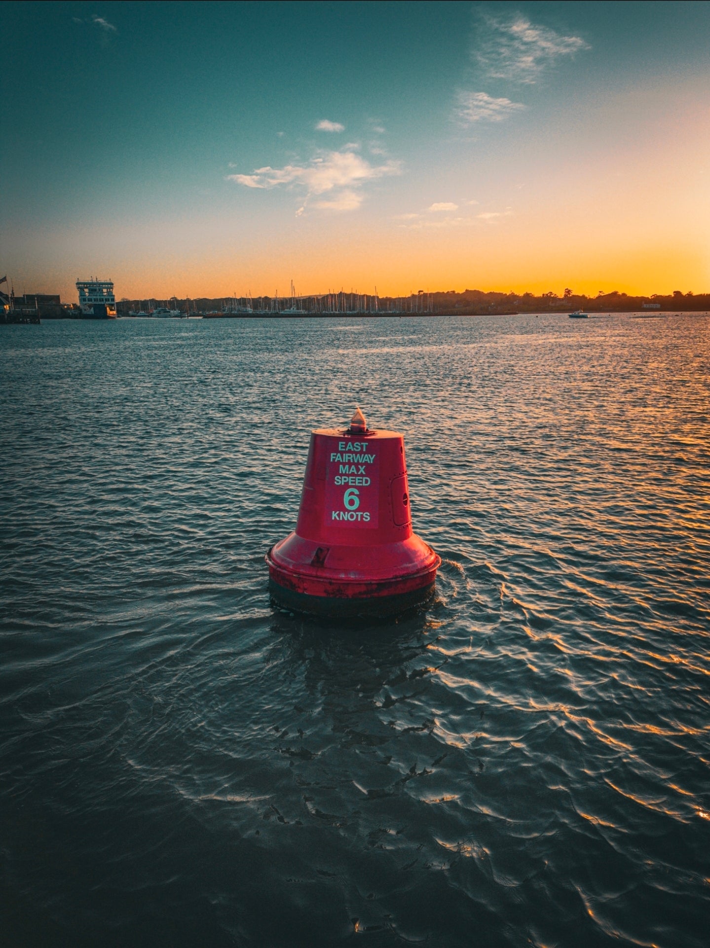 As the sun sinks toward the horizon, the harbour settles into a quiet rhythm. In this moment, the “East Fairway” buoy stands alone, anchored against the gentle movement of the tide, its bold red form glowing under the last light of day. The six-knot warning feels almost poetic here. A reminder to slow down, breathe, and take it all in.