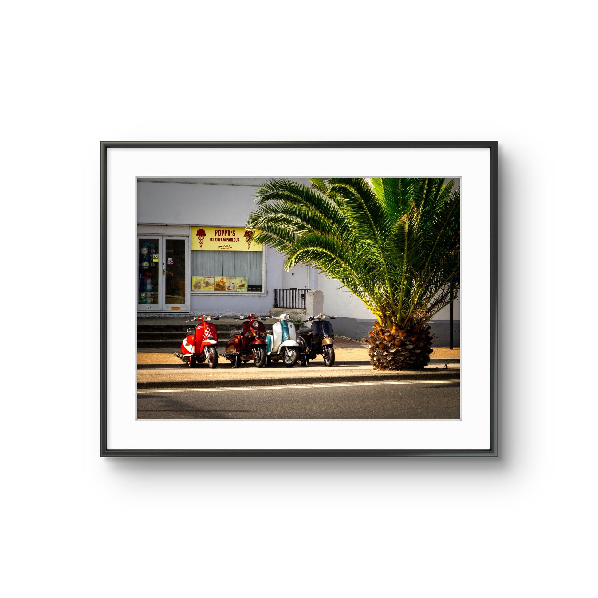 This fine art print blends retro charm and Mediterranean flair, though it was photographed right here on the Isle of Wight. The bold colours of the scooters contrast beautifully against the greenery of the palm and the crisp façade of the ice cream shop, creating a playful yet stylish composition.
