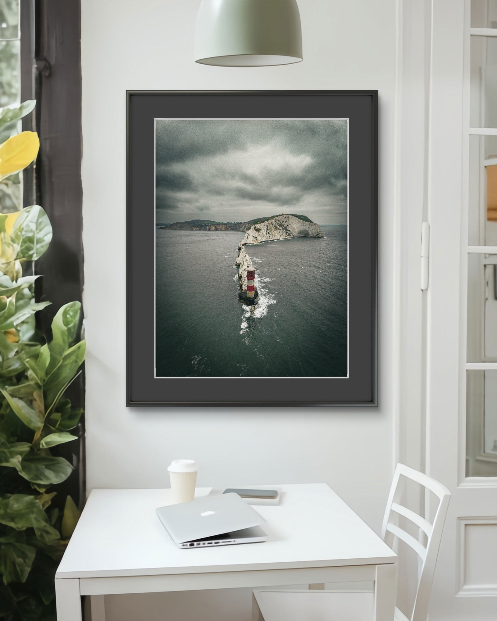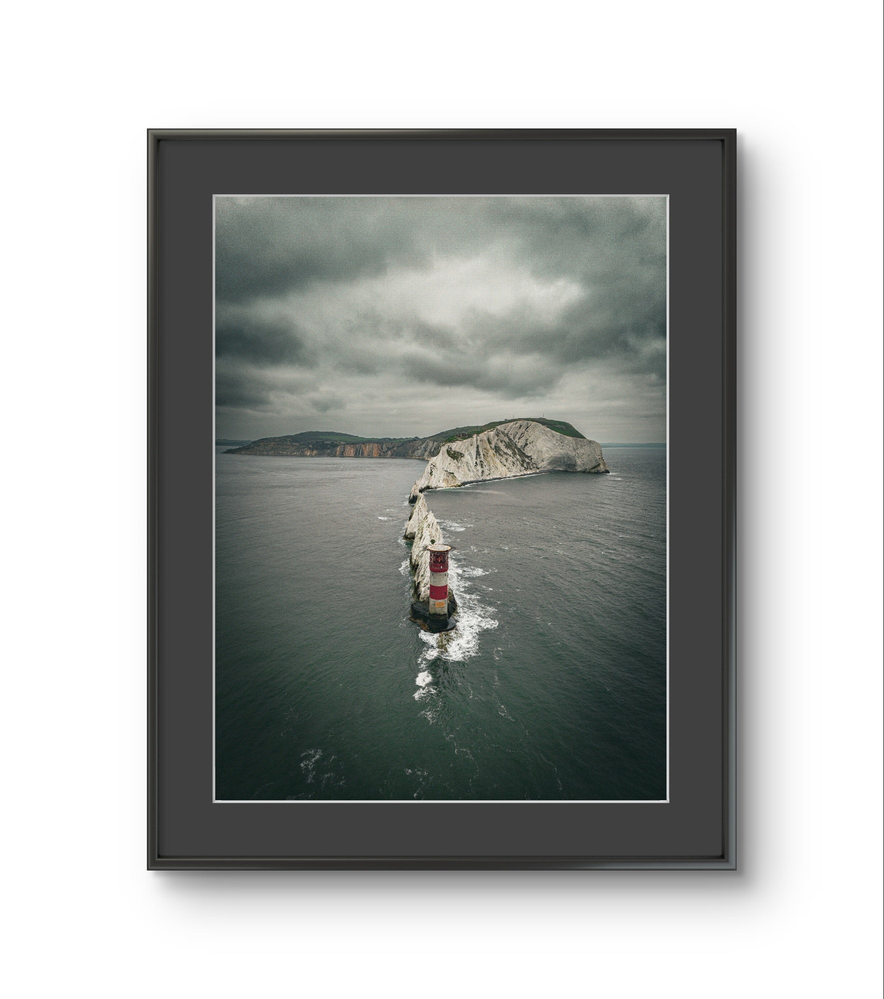 A breathtaking aerial capture of The Needles, Isle of Wight, reveals nature’s raw power and timeless beauty. Jagged chalk formations stretch defiantly into the restless sea, their stark white contrast against the deep, moody waters. The iconic red-and-white lighthouse stands as a lone sentinel, weathered yet unwavering amidst the swirling currents.